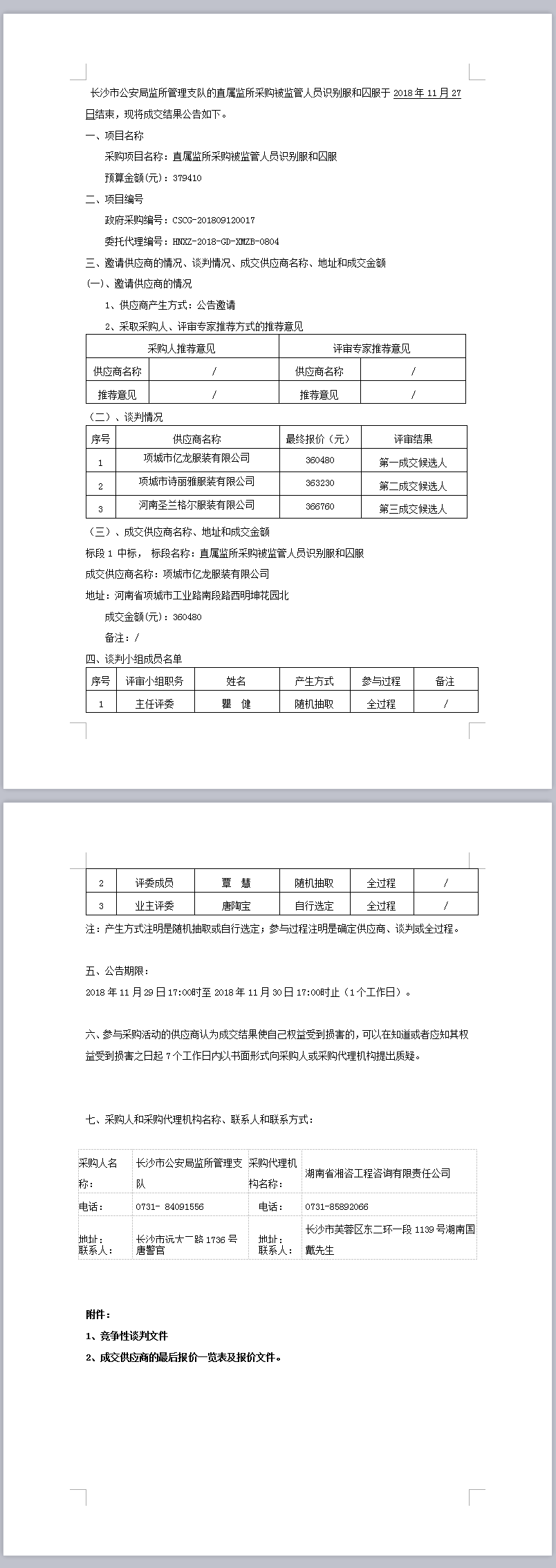 長(zhǎng)沙市公安局監(jiān)所管理支隊(duì)直屬監(jiān)所采購(gòu)被監(jiān)管人員識(shí)別服和囚服(第二次)結(jié)果公告