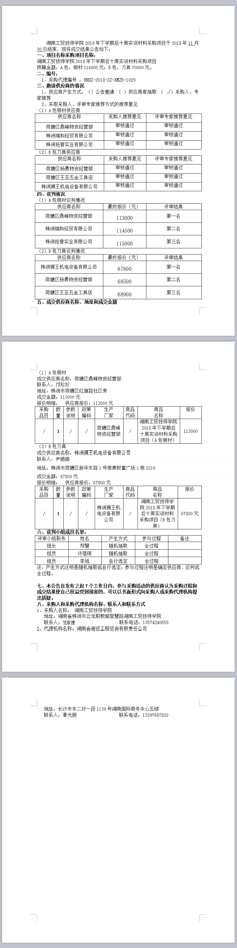 湖南工貿技師學院2018年下學期后十周實訓材料采購項目競爭性談判成交公告