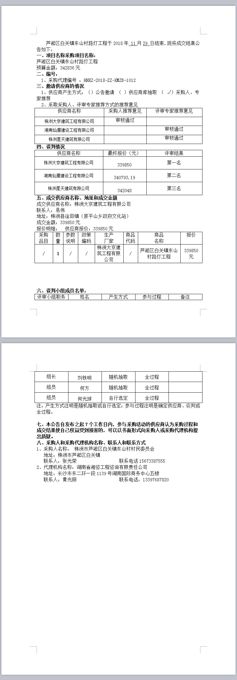 蘆淞區(qū)白關(guān)鎮(zhèn)東山村路燈工程 競爭性談判成交公告