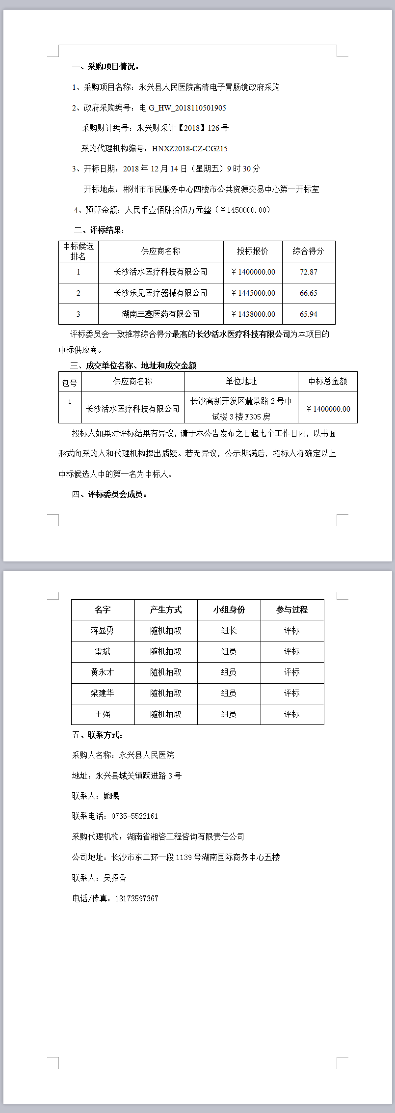 永興縣人民醫院高清電子胃腸鏡政府采購中標結果公示