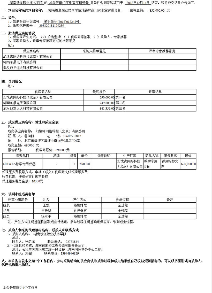 湖南鐵道職業技術學院地鐵屏蔽門實訓室實訓設備競爭性談判成交公告