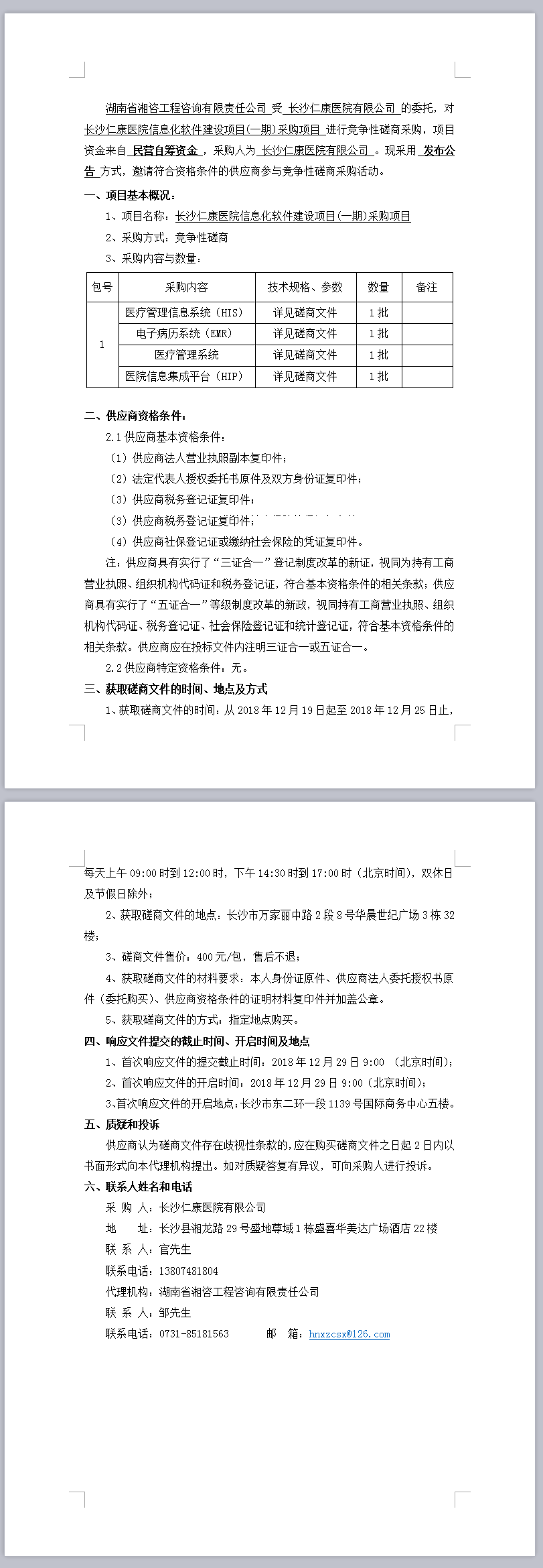 長沙仁康醫院信息化軟件建設項目(一期)采購項目磋商邀請公告