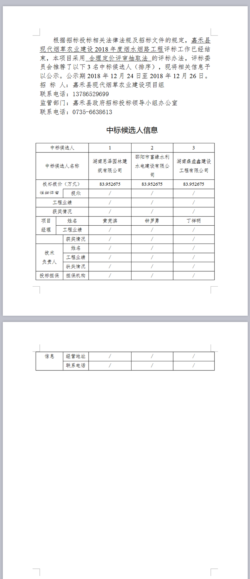 嘉禾縣現代煙草農業建設2018年度煙水煙路工程中標候選人公示
