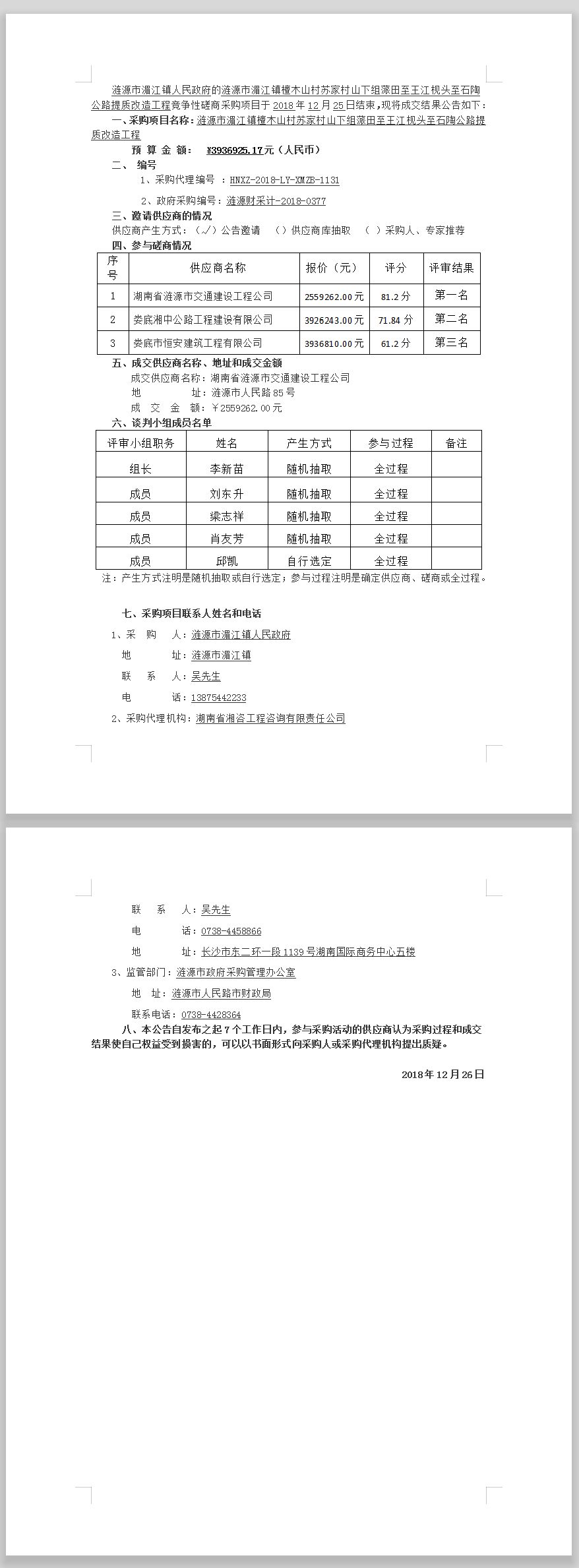 漣源市湄江鎮檀木山村蘇家村山下組蒎田至王江枧頭至石陶公路提質改造工程競爭性磋商成交結果公告