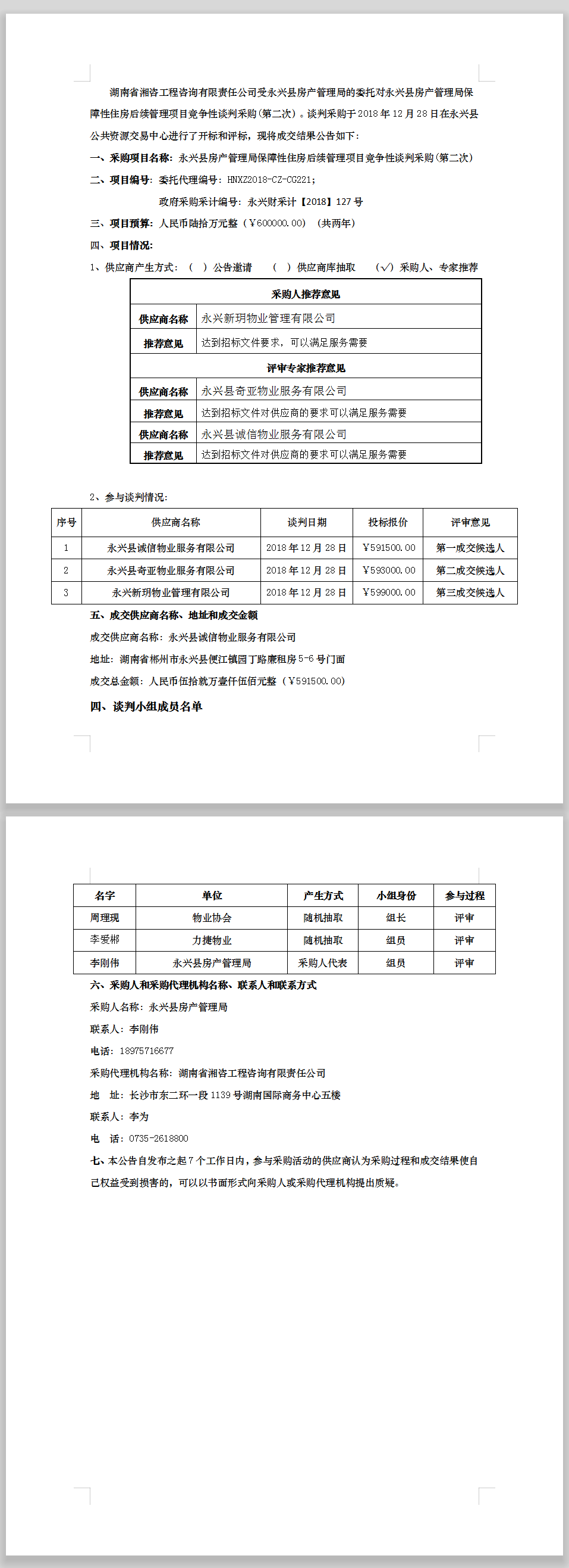 永興縣房產(chǎn)管理局保障性住房后續(xù)管理項目 競爭性談判采購(第二次)成交公告