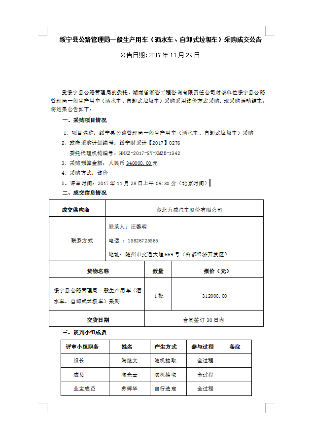 綏寧縣公路管理局一般生產用車(灑水車、自卸式垃圾車)采購成交公告