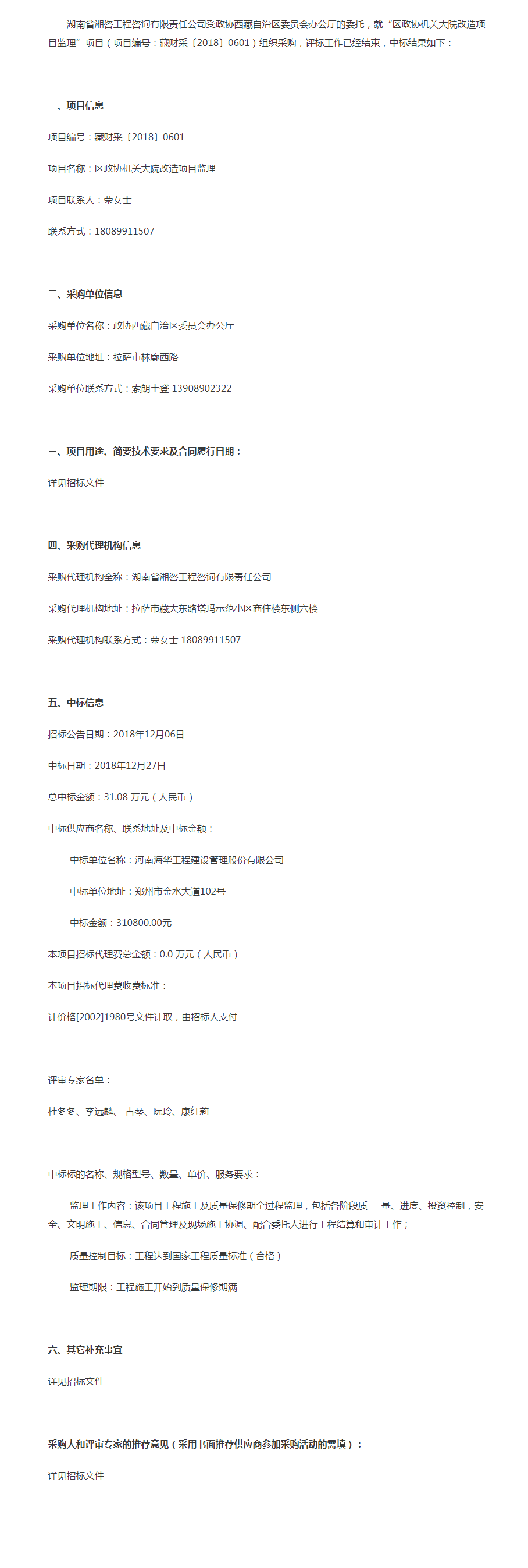政協西藏自治區委員會辦公廳區政協機關大院改造項目監理中標公告
