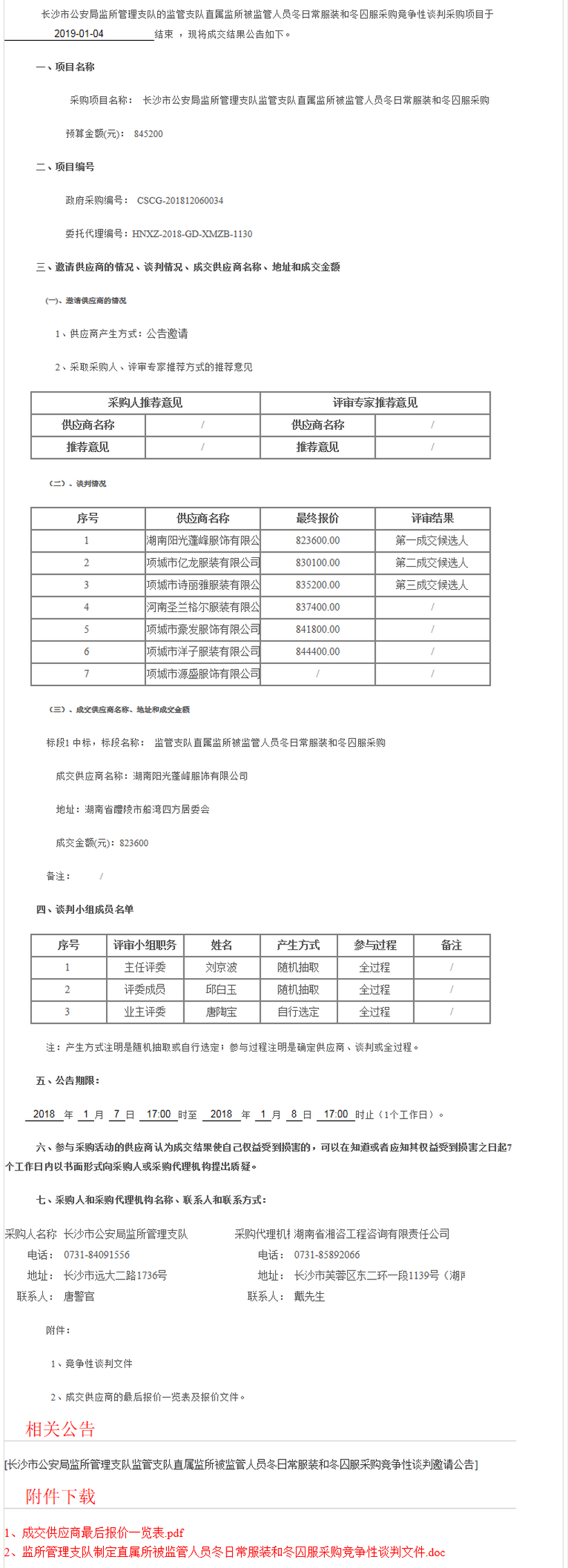 長沙市公安局監所管理支隊監所管理支隊制定直屬所被監管人員冬日常服裝和冬囚服采購結果公告