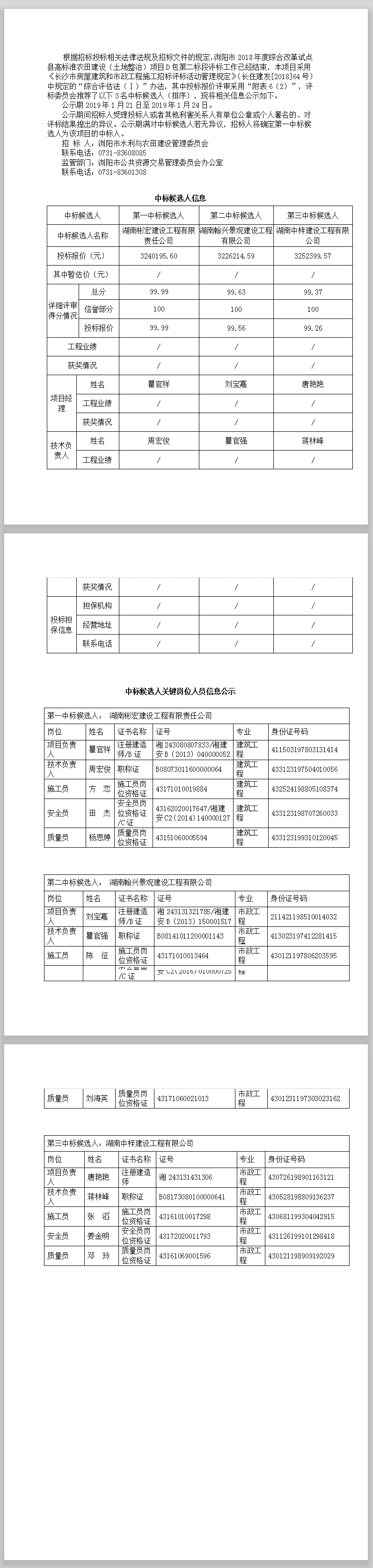 瀏陽市2018年度綜合改革試點縣高標準農田建設(土地整治)項目D包第二標段 中標候選人公示