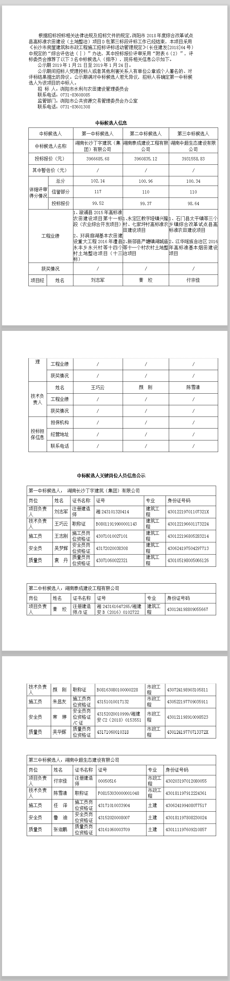 瀏陽市2018年度綜合改革試點縣高標準農田建設(土地整治)項目D包第三標段中標候選人公示