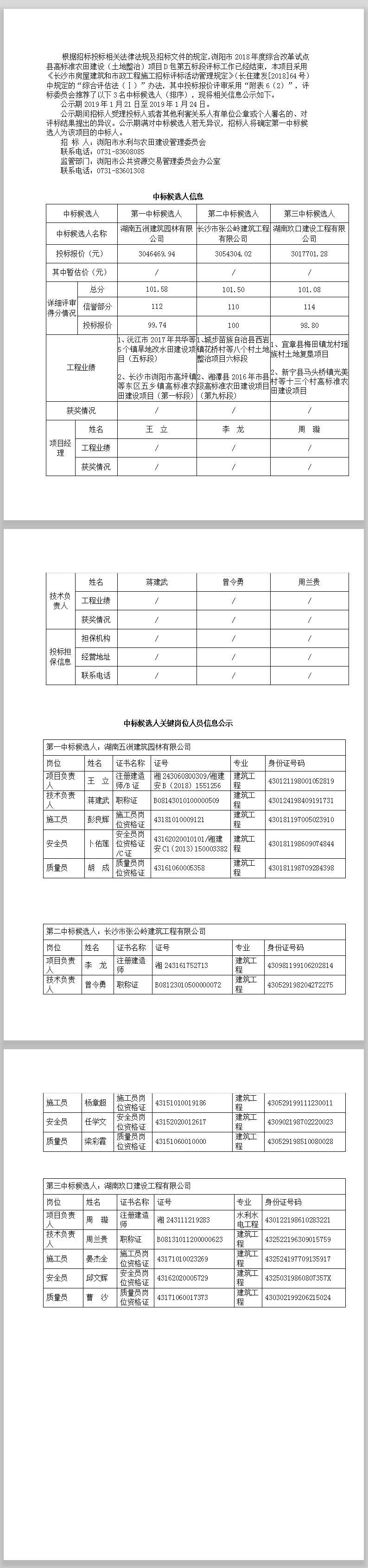瀏陽市2018年度綜合改革試點縣高標準農田建設(土地整治)項目D包第五標段 中標候選人公示