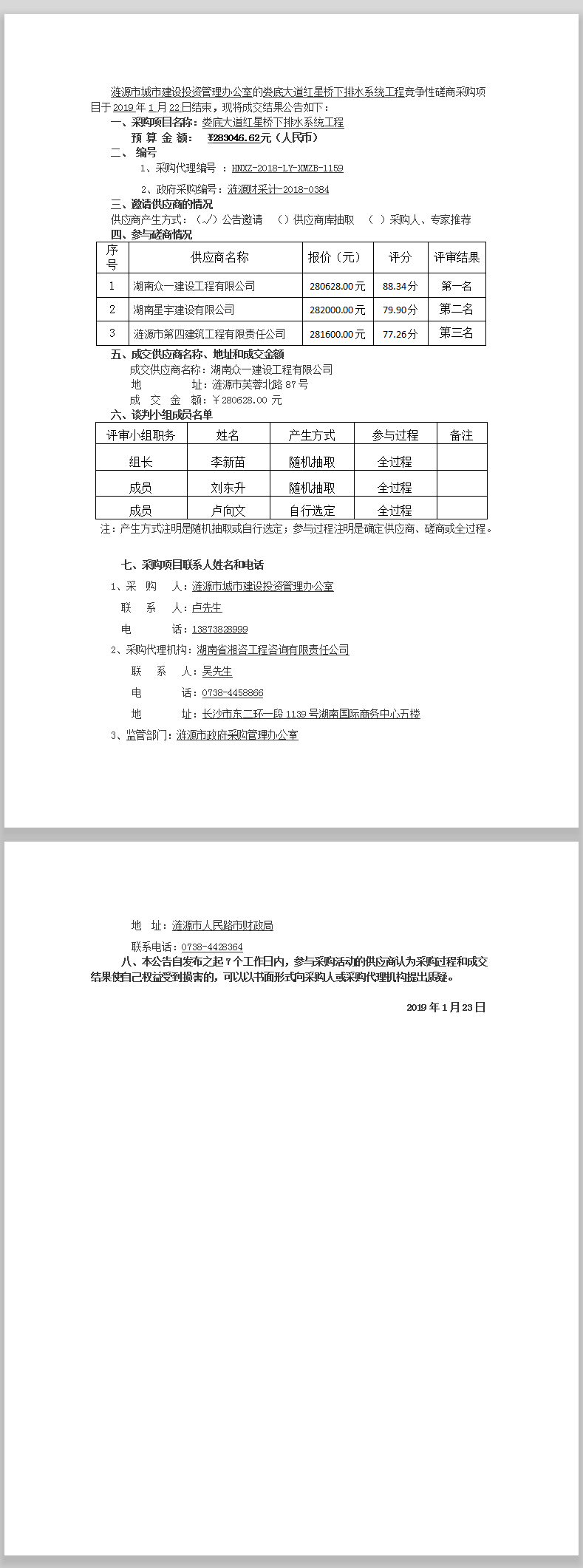 婁底大道紅星橋下排水系統工程 競爭性磋商成交結果公告