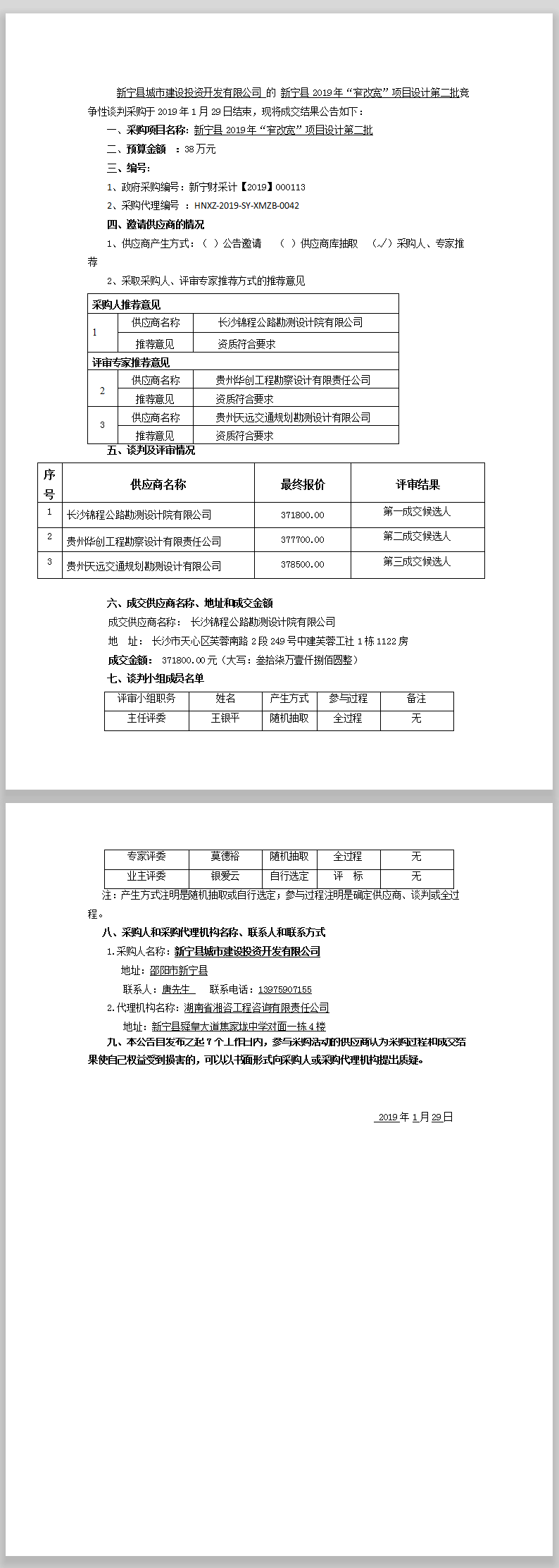 新寧縣2019年“窄改寬”項目設計第二批 競爭性談判成交結果公告