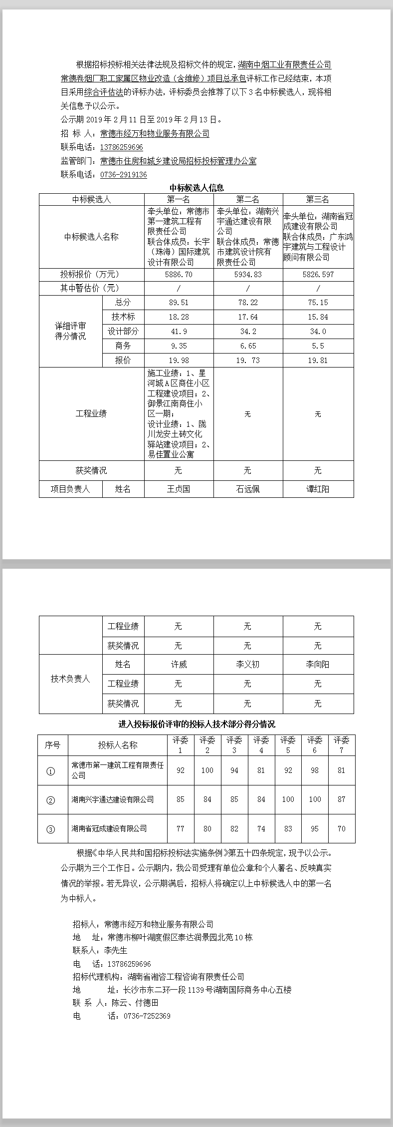 湖南中煙工業有限責任公司常德卷煙廠職工家屬區物業改造(含維修)項目總承包中標候選人公示