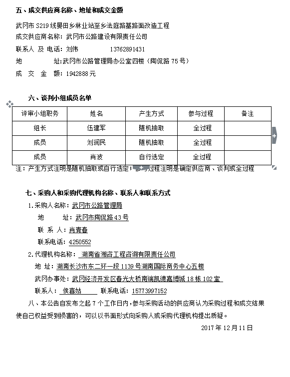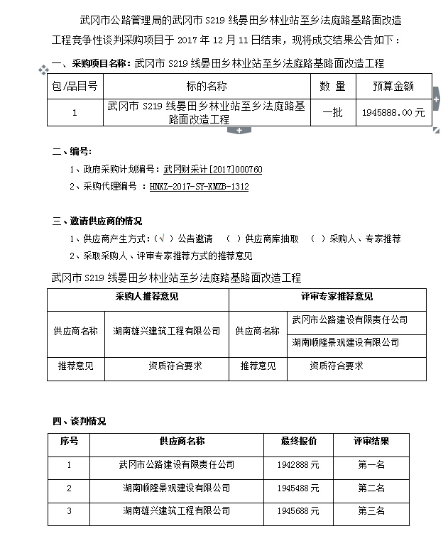 武岡市S219線晏田鄉林業站至鄉法庭路基路面改造工程競爭性談判成交結果公告