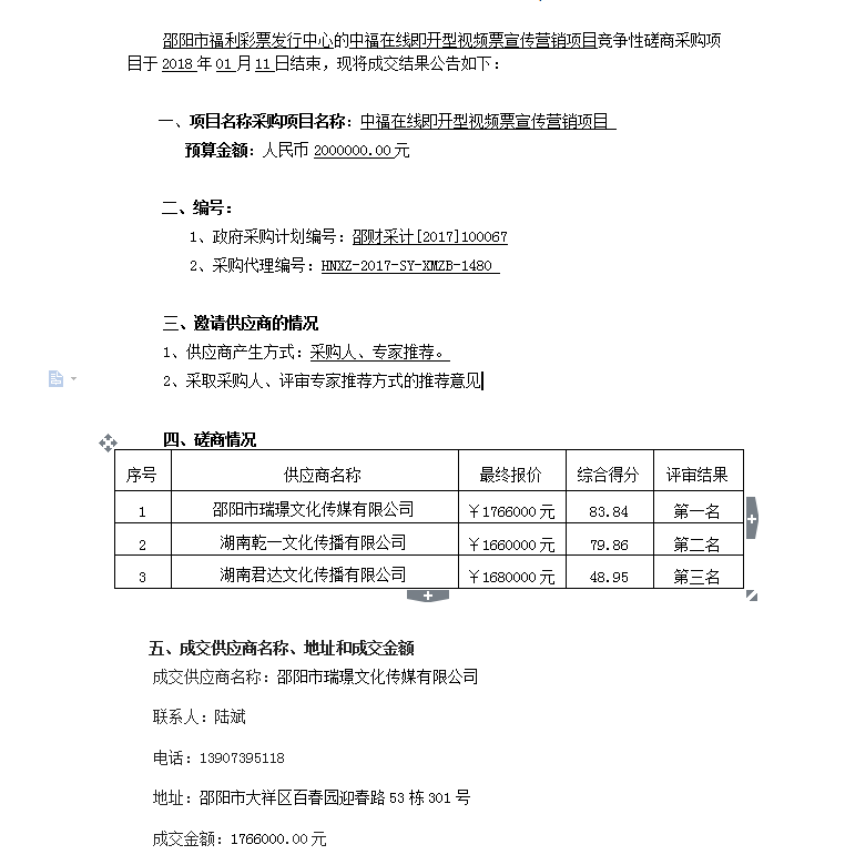 中福在線即開型視頻票宣傳營銷項目 競爭性磋商成交公告