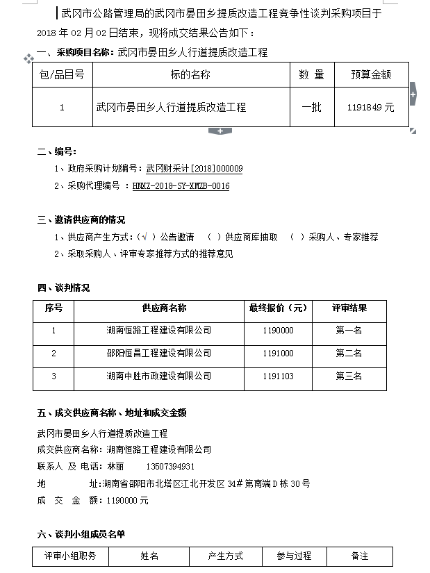 武岡市晏田鄉人行道提質改造工程 競爭性談判成交結果公告
