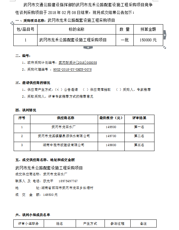武岡市龍禾公路配套設(shè)施工程采購項目 競爭性談判成交結(jié)果公告