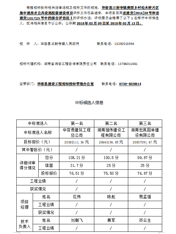 華容縣三封寺鎮美麗鄉村松木橋片區集中建房點公共設施配套建設項目中標候選人公示