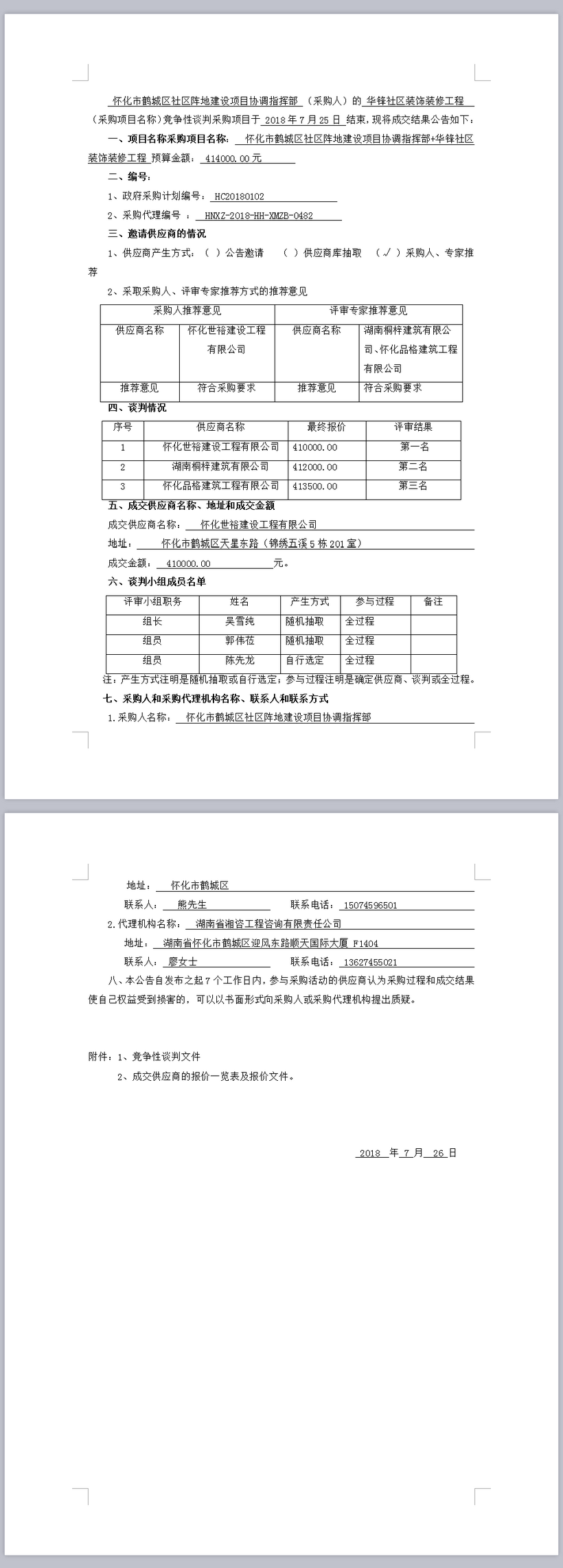 懷化市鶴城區(qū)社區(qū)陣地建設(shè)項目協(xié)調(diào)指揮部+華鋒社區(qū)裝飾裝修工程競爭性談判成交結(jié)果公告