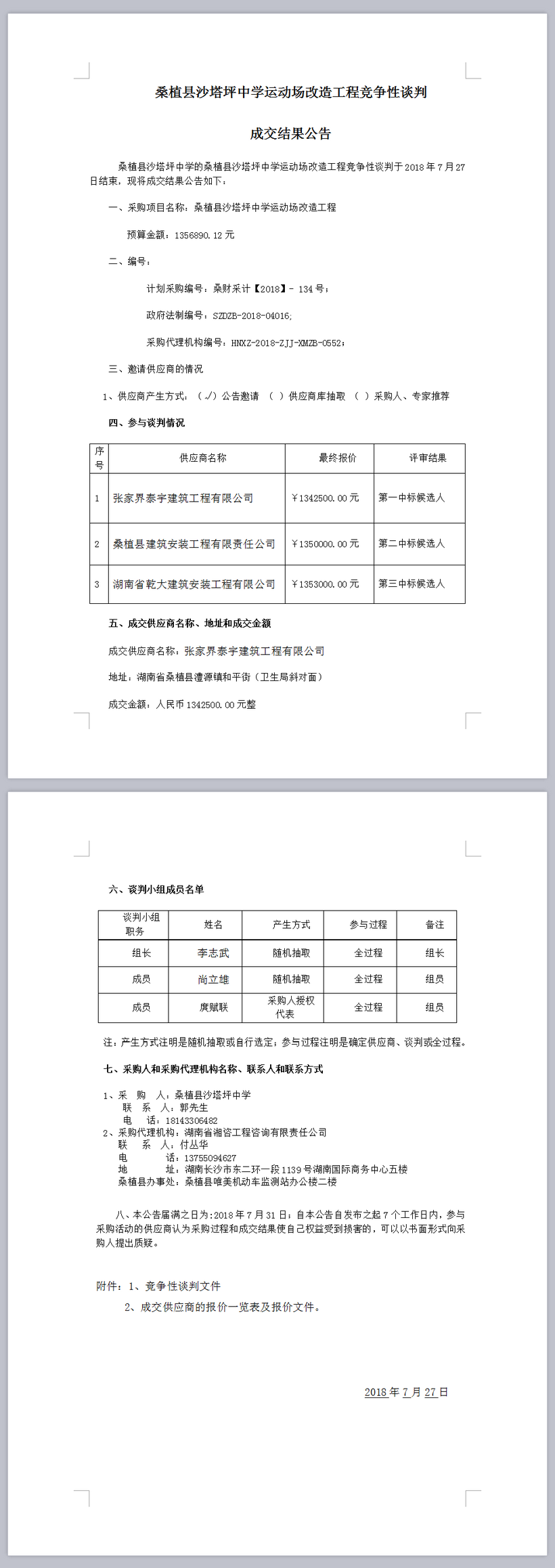 桑植縣沙塔坪中學運動場改造工程談判成交公告