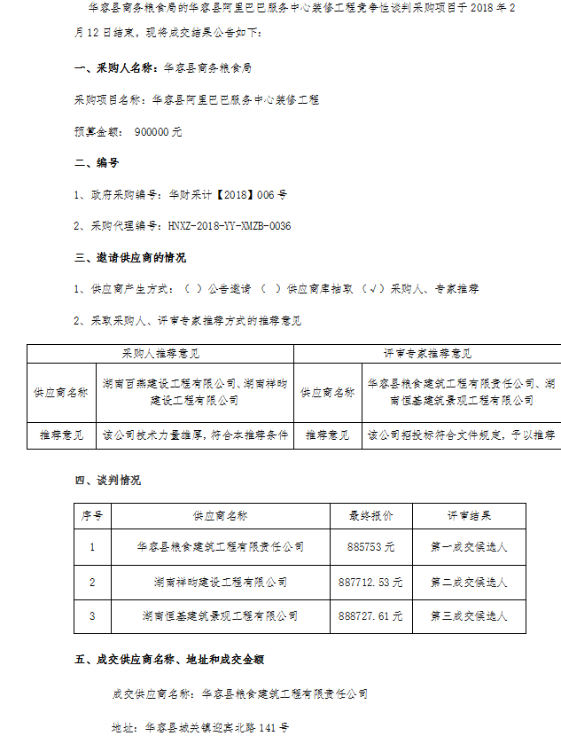 華容縣阿里巴巴服務中心裝修工程政府采購項目競爭性談判 成交結果公告