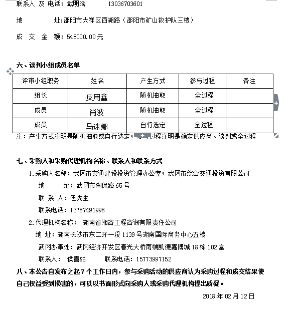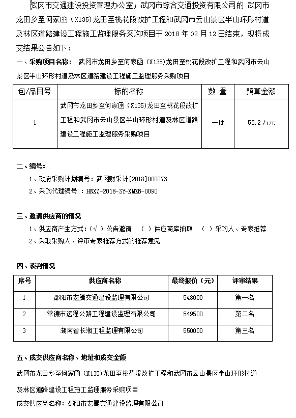 武岡市龍?zhí)镟l(xiāng)至何家函(X135)龍?zhí)镏撂一ǘ胃臄U(kuò)工程和武岡市云山景區(qū)半山環(huán)形村道及林區(qū)道路建設(shè)工程施工監(jiān)理服務(wù)采購(gòu)項(xiàng)目 競(jìng)爭(zhēng)性談判成交結(jié)果公告