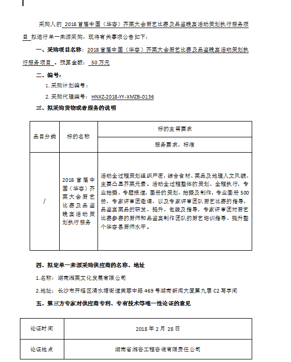 2018首屆中國(華容)芥菜大會廚藝比賽及品鑒晚宴活動策劃執(zhí)行服務項目單一來源公告