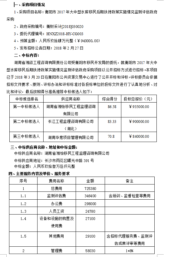 衡陽市2017年大中型水庫移民后期扶持政策實施情況監測評估政府采購中標公告
