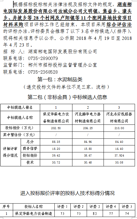 湖南郴電國際發展股份有限公司汝城分公司文明鎮、集益鄉、濠頭鄉、井坡鄉等28個村網及盧陽鎮等11個配網易地扶貧項目材料采購中標候選人公示