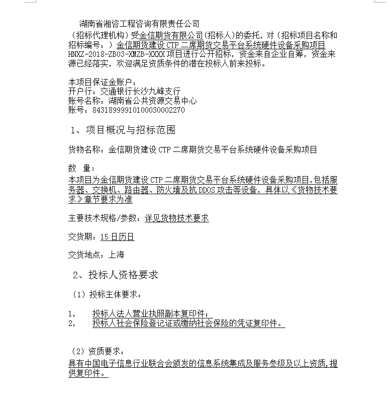 金信期貨建設CTP二席期貨交易平臺系統硬件設備采購項目投標邀請