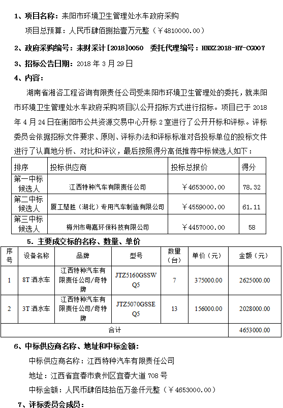 耒陽(yáng)市環(huán)境衛(wèi)生管理處水車政府采購(gòu)評(píng)標(biāo)結(jié)果公示
