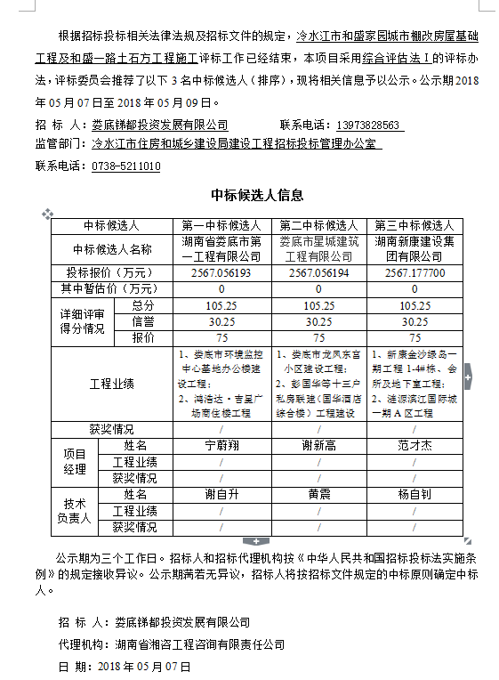 冷水江市和盛家園城市棚改房屋基礎工程及和盛一路土石方工程施工中標候選人公示