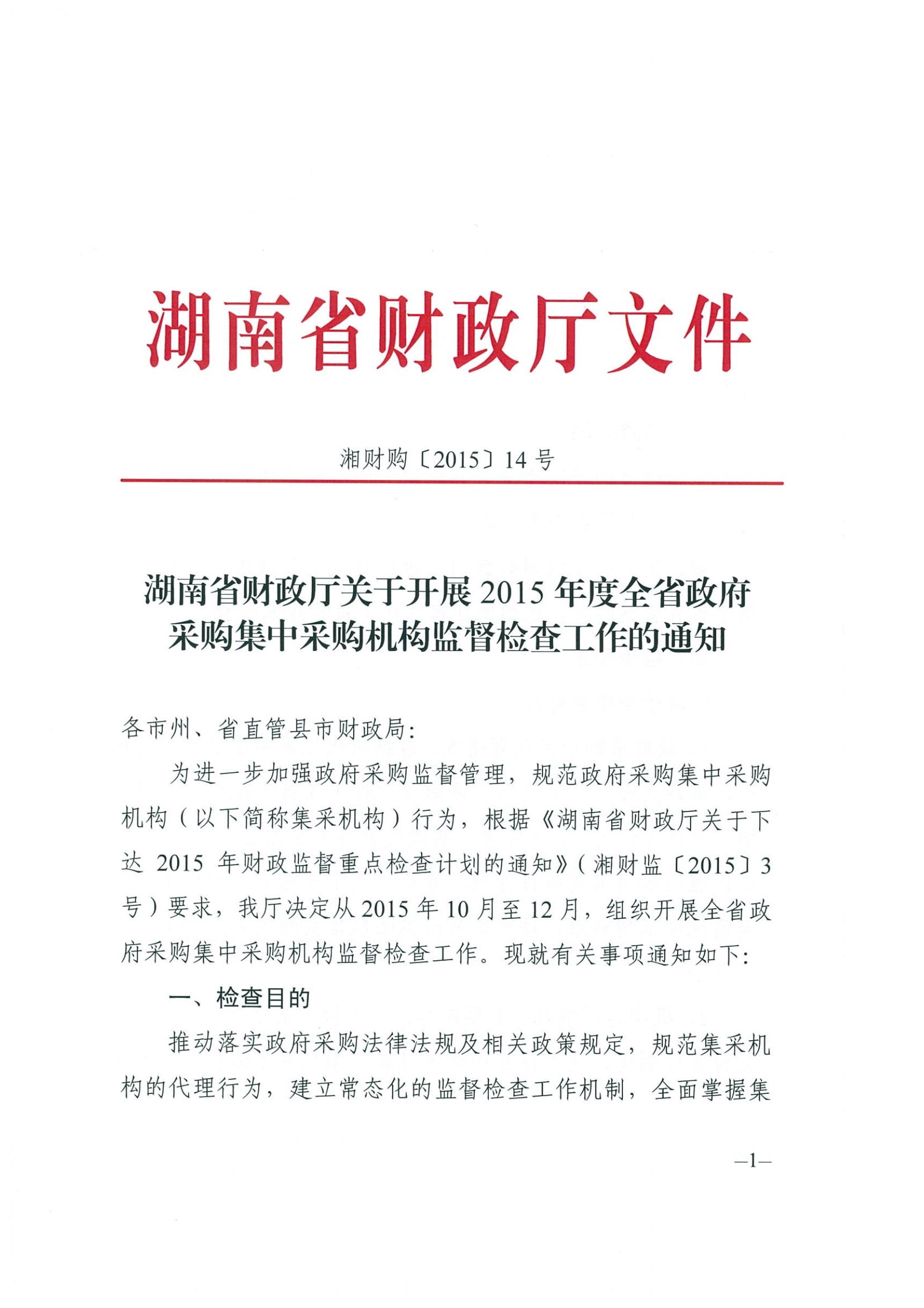 湖南省財政廳關于開展2015年度全省政府采購集中采購機構監督檢查工作的通知(湘財購【2015】14號)
