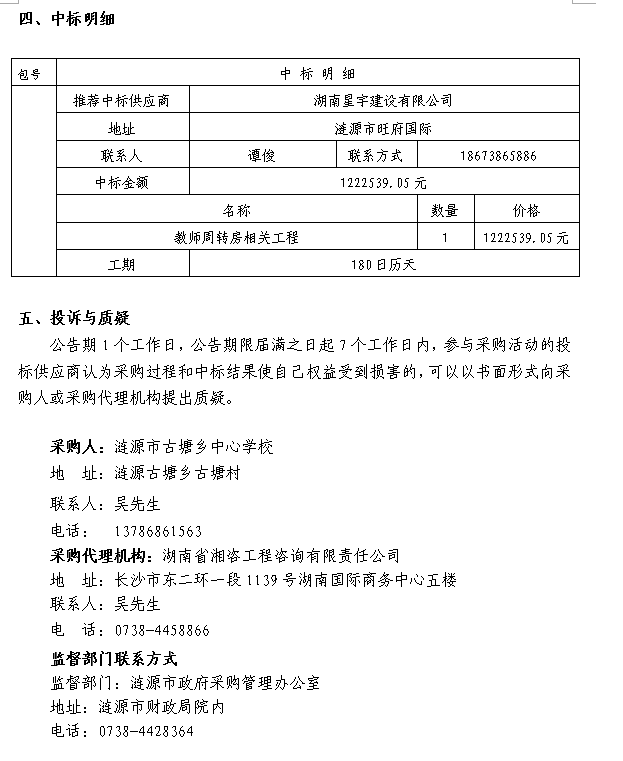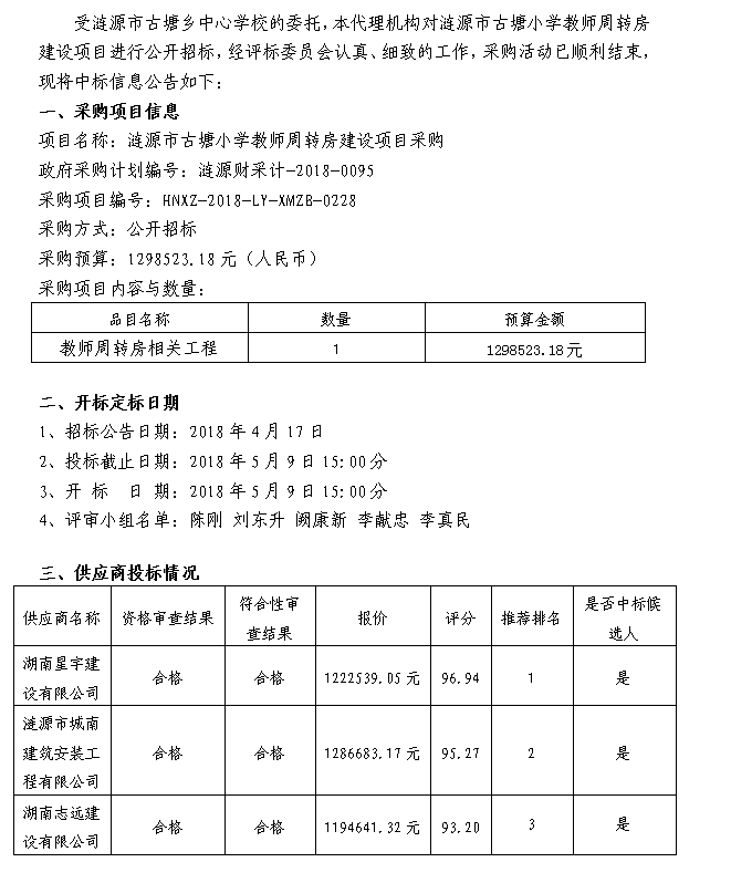 漣源市古塘小學教師周轉房建設項目采購中標結果公告