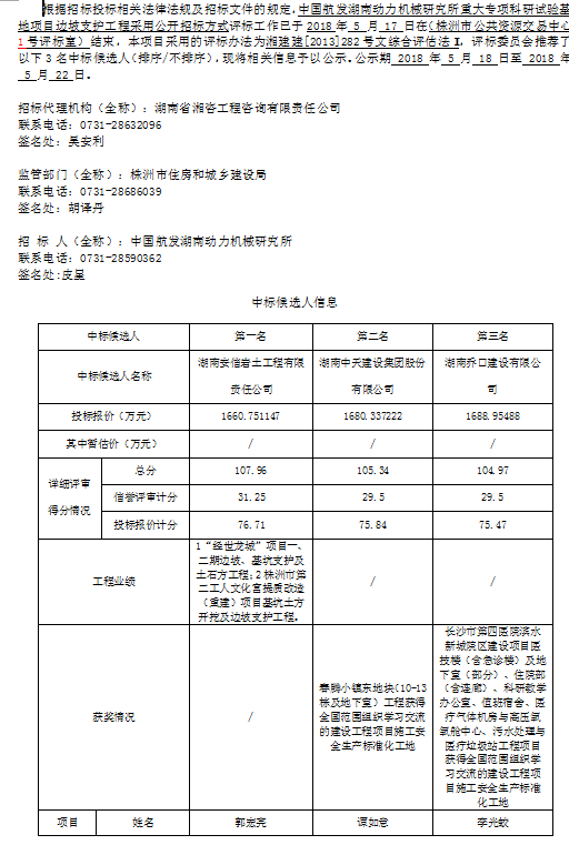 中國航發湖南動力機械研究所重大專項科研試驗基地項目邊坡支護工程招標投標信息公示表
