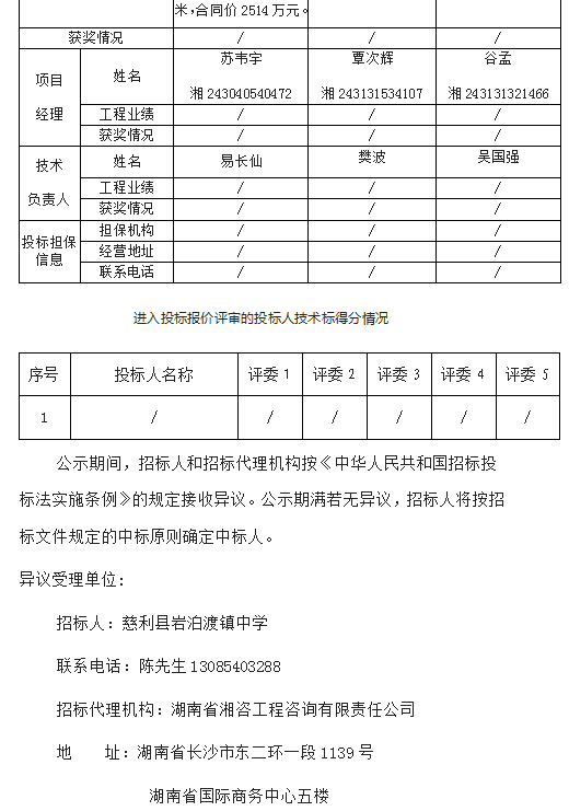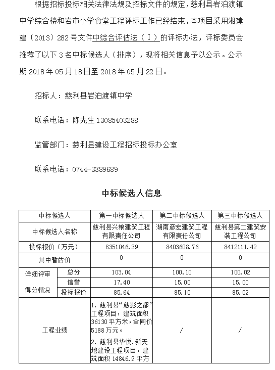 慈利縣巖泊渡鎮(zhèn)中學綜合樓和巖市小學食堂工程施工招標投標信息公示表