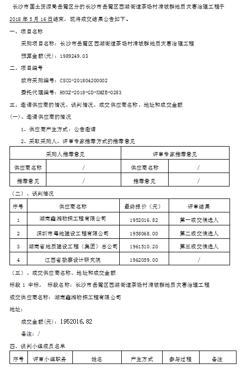 長沙市國土資源局岳麓區(qū)分局長沙市岳麓區(qū)西湖街道茶場村滑坡群地質(zhì)災(zāi)害治理工程結(jié)果公告